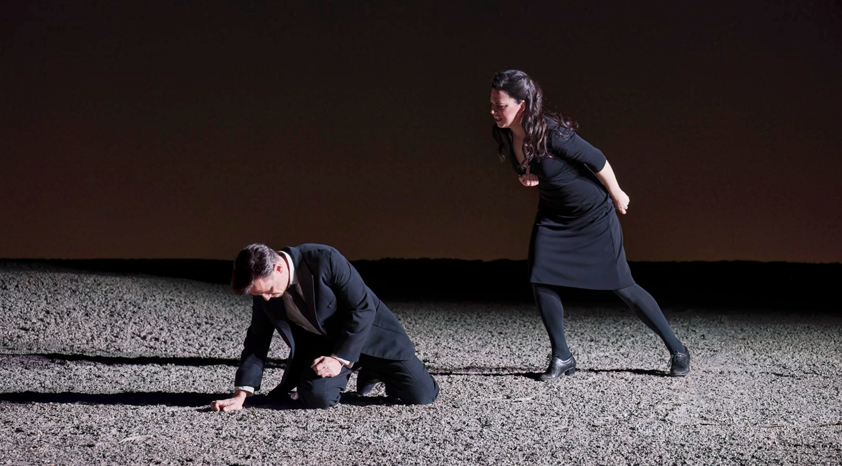 When the performance begins, we see an expanse of dark earth covering the stage of the Four Seasons Centre. The sky at the back is gloomy and darkness is the dominant feature. There is a mound of earth beside an open grave and we hear the somber, funereal singing of the chorus. They are supposed to be shepherds and nymphs but they are all dressed in black and we can’t really see them in the darkness.