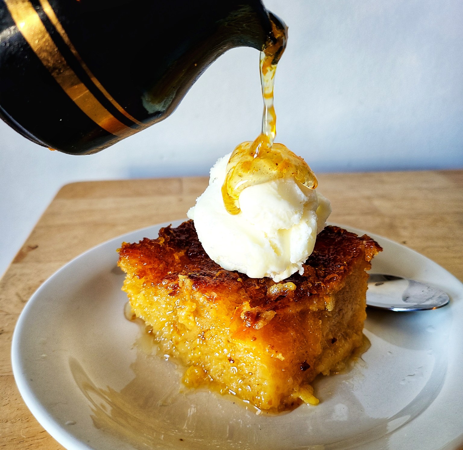 To serve, cut a piece, plate, place a scoop of vanilla ice cream on top and pour some reserved orange syrup on top.